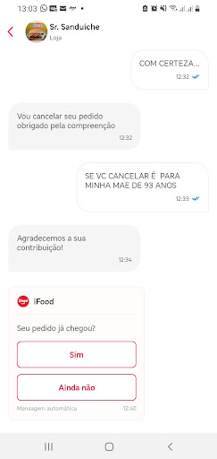 Hoje dia 08(dia das mulheres,rs),esse lugar foi desumano com uma pessoa de 93anos!!!!Pedi pelo ifood um almoço para minha mãe, que deveria chegar até 12:15h. Quando foi 12:30h entrei para saber o atraso,e a pessoa nem para ser educada pedir desculpas...ou ter enviado uma mensagem por lá mesmo dizendo que iria atrasar NADA!!!!!Como estava nervosa disse que iria dar 1 estrela pela atitude.Na hora esse atendente da loja,disse que peça em outro lugar e iria cancelar o pedido,que pelo ifood estava chegando!!!! Gente...eu acho que pessoas que tratam outras assim,mesmo eu dizendo que era para minha mãe de 93anos foi lá e cancelou,o que falar....argumentar....?Será que dorme em paz???Espero de coração, que o...