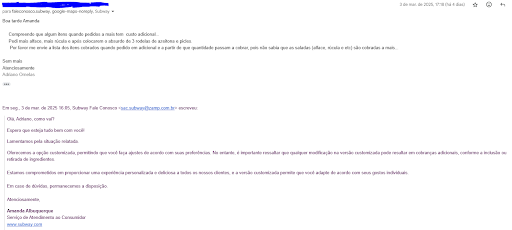 Read moreGostaria de relatar a péssima experiência que tive Subway da Presid. Kennedy na Praia grande -SP ... Sempre lanchei nesta unidade do subway e nunca tive problemas até hoje. Efetuei meu pedido na hora na montagem o funcionário colocou 3 rodelas de azeitona ( isso mesmo 3 rodelas nem é uma azeitona inteira kk) quando pedi para por mais mesmo disse que já havia colocado e que só podia colocar 3, pedi para colocar mais pickles e a mesma história... Só faltou contar as migalhas de alface... Achei um absurdo pois não era desta forma o atendimento, questionei o funcionário e o mesmo chamou a gerente que disse que era isso mesmo... Nunca fiz isso... mas abandonei o pedido pois achei um desafaro. É exatamente desta forma que uma empresa perde seus clientes e não importa o tamanho uma hora ela quebra. 07/03/2025 - após minha reclamação entraram em contato via e-mail para entender o que aconteceu. Mas do que adianta se a resposta ainda é mais insatisfatoria do que a propria pergunta e quando se pergunta algo não ha retorno... mais um desesrespeito ao cliente. E nao adianta responder que lamenta se nada muda e não há uma resposta. Segue em anexo resposta pelo ocorrido e a falta de retorno mediante meu...