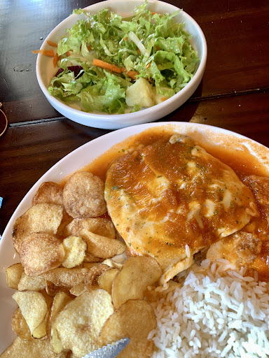 Acompanhando o PF tem uma salada com alface, pepino, cenoura, repolho e beterraba. Pedimos uma parmegiana de frango que acompanha arroz e batata chips. O molho é gostoso, o frango a milanesa estava bem feito e bem saboroso. Acho que poderia ter um pouco mais de batata chips mas fora isso é muito bem servido.