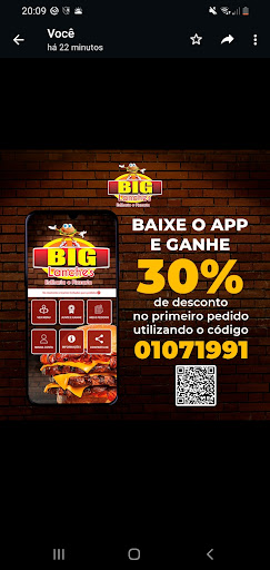 Read morePéssimo! Anunciaram que a primeira compra pelo aplicativo teria 30% de desconto com o código, baixei o aplicativo e ao finalizar a compra o código estava inválido, entrei em contato com o Big lanches para me ajudarem e fui informada que era válido apenas para a primeira semana, sendo que o informativo dizia que era válida para a primeira compra não especificado a data para a utilização! A pessoa responsável pelo restaurante, Sr. Bruno, informou que foi um erro deles por não informarem a gráfica, ou seja, caracteriza propaganda enganosa !...