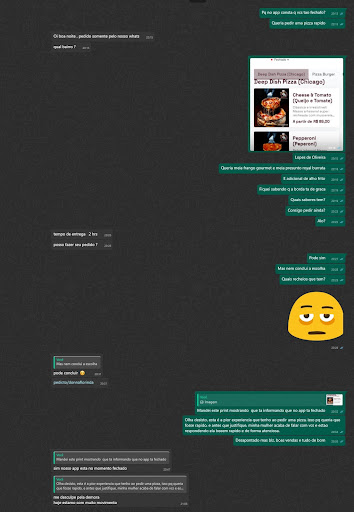 Depois dessa reclamação e do fato de não aceitarmos outra pizza, minha esposa mandou outra mensagem e foi simplesmente ignorada (assim como das outras vezes que reclamamos)