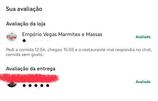 Read moreFiz meu pedido no restaurante via aplicativo no sábado 20/09 às 12:54 e chegou apenas às 15:05 (tenho print), tentei contato com o restaurante e fui mal atendida, no fim a comida estava ruim e sem sal, avaliei normalmente no ifood de acordo com a minha experiência e meu comentário foi reportado como avaliação indevida porque avaliação ruim sobre a entrega era responsabilidade do aplicativo, porém também tenho print ( também fica salvo no histórico de pedidos) que avaliei a corrida com 5 estrelas e o restaurante com 1, então não entendi porque meu comentário foi reportado, então decidi reportar aqui! Péssimo atendimento,...