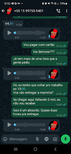 Read moreFui buscar uma marmita no final de semana e pasmem, me deixaram de pé esperando por 40 minutos, isso mesmo 40 minutos para montar uma marmita. Quando recebi a marmita, estava errada, e então mais 15 minutos. Um descaso total, além disso não vi limpeza no restaurante, e quando cheguei em casa, a marmita estava com uma qualidade questionável. Foi a segunda experiência no restaurante, tive uma primeira mas imaginei que era algo pontual, o que não ocorreu. Espero que melhorem de fato a...