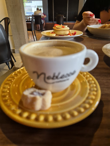 A Noblesse utiliza um cardápio digital via tablet, onde você mesmo faz o pedido, o que torna tudo bem prático. Nosso pedido chegou super rápido! Pedimos um café coado, um sanduíche, pão de queijo recheado, um cappuccino e um "beijinho do amor" (a tradicional bala baiana). Tudo estava delicioso, e os preços são justos pela qualidade oferecida.