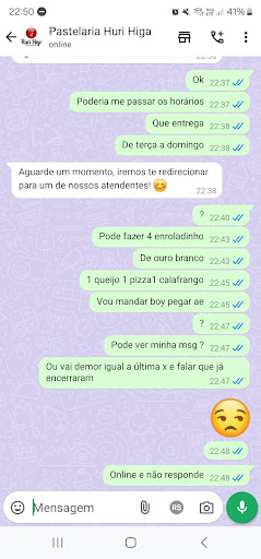 Read moreBom dia, acabei de tentar comer um pastel na feira em Sorocaba, na vila Leão, e não consegui. O atendimento péssimo, meninas mau humoradas, mau educadas, nem bom dia te dão, apenas por educação, porque isso vem de casa. Pois bem, não termina a minha raiva, pedi um mini especial de frango e de portuguesa, esse último estava todo mole, massa toda quebradiça, esfarelando, pra terminar na metade do pastel ele caiu inteiro no chão, sujando toda a minha roupa. Fui reclamar, eu não estava pedindo outro, só fui reclamar, fizeram cara de paisagem, deboche, e ficaram rindo. Não sei como podem colocar pessoas assim. Isso não são profissionais....