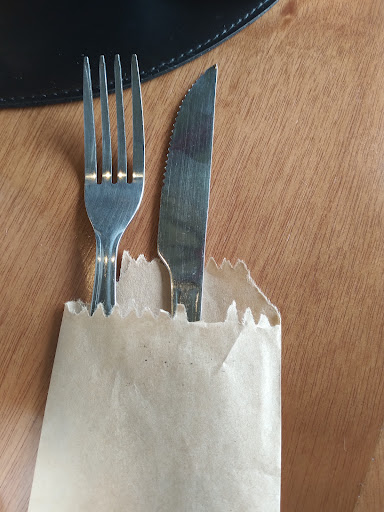 chamo a atenção para um item de segurança: os talheres, garfo e faca, são postos num envelope, mas com as pontas para a direção da abertura, o q pode ferir facilmente um cliente mais desatento (vide fotos). para isso, é só inverter a posição deles.