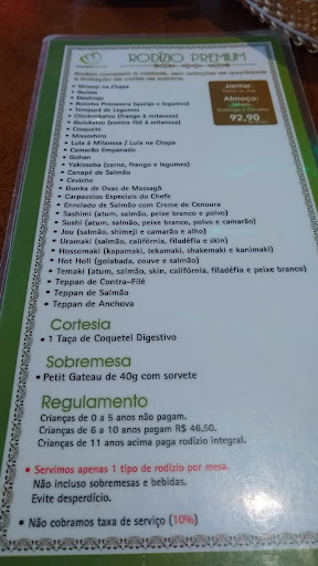 Read moreUma experiência bem decepcionante. Acredito que a comida “japonesa” por ser a febre no Brasil, se tornou algo bem comum. O que tenho percebido é a repetição de pratos, sem inovações, com sabor vazio e sem grandes impactos. Foi assim nesse restaurante. Apresentações normais, o gosto dos pratos e das peças bem insossos. As entradas sem graça, ceviche que me parece ser feito no dia anterior. Temakis com algas moles. O frito é enorme (isso não é positivo) , nada delicado e cheio de óleo. Ah, tem outro detalhe; agora a moda é colocar óleo de trufas em tudo. Péssima escolha. Os pratos quentes são requentados e os fritos tem excesso de óleo como no exemplo do temaki. A sobremesa não é compatível com um rodízio “especial” ou “premium” como preferir. Está cada vez mais difícil encontrar um restaurante de culinária japonesa interessante no Brasil. O ambiente é estranho com muitos funcionários, sem música ambiente e podendo ouvir com detalhe a conversa das mesas ao redor. O Serviço é um ponto médio, onde claramente percebe-se que o treinamento é uma fraqueza. Alguns com mais experiência até ajudam, mas a maioria peca no servir. O único ponto positivo da experiência é o fato de o restaurante não cobrar a taxa de serviço (o que acho um absurdo no Brasil) devido as leis trabalhistas. Em países onde o garçom é informal, faz sentido o pagamento de gorjeta (tip). No Brasil, nem pensar. Infelizmente não tem como...