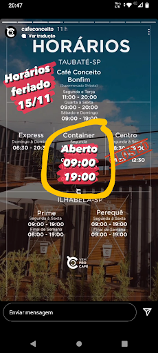 Conclusão além da demora nos pedidos em todas experiências que tive, tem sempre a falta de alguma comida no cardápio. Cheguei até fazer uma piada com meu namorado dizendo que deveria mudar o nome do local para “Só Café e afins”, com sublegenda bem pequena “Só quando eu estiver afim”, pois é sempre na vontade deles e nunca tem tudo que está no cardápio. Nesse caso é mais fácil reduzir o cardápio para produtos que vocês tem certeza que terão à disposição do cliente pelo menos 99% da vezes do que apresentar opções que nunca tem...