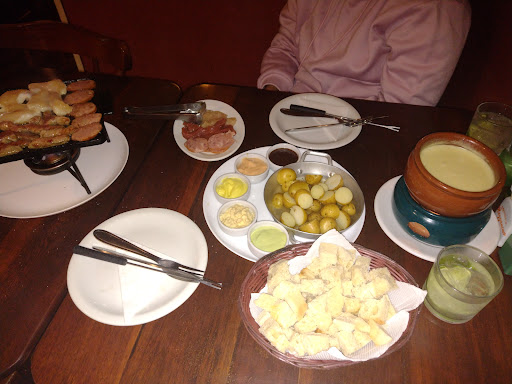 Read moreSábado fomos pela primeira vez a casa em dois casais e a experiência foi muito boa, começando pelo atendimento que era excepcional. Fomos atendidos pelo garçom Amauri, que foi muito solícito e eficiente sugerindo inclusive um vinho que foi do agrado de todos. Uma mulher loira, suspeito ser a gerente ou dona, muito simpática e preocupada em garantir que tudo estivesse em harmonia. Ficamos em uma mesa, embaixo de um toldo, uma espécie de varanda, ao lado do som de gaita de um senhor também muito simpático, foram músicas conhecidas e demos muitas risada, às vezes o som ficava um pouco alto para conversar, mas a gerente estava bem atenta e pedia para regular. Quanto a comida em si, pedimos um festival de fondues para cada casal (R$ 124 por casal), a quantidade a princípio não é tão servida, mas saímos satisfeitos, nos quais ambos caras (incluindo eu) costumamos comer muito bem. O fondue de três tipos diferentes de queijo estava muito bom, pão não estava passado e em momento nenhum nada queimou ou ressecou. O de carne foi servido em forma de carpaccio enrolado, com umas oito opções de molho, barbecue, alho, vinagrete, geleia de morango com pimenta, pate de azeitona roxa, tártaro, mostarda... Cozido em um caldo de carne, sem óleo, mas era até que rápido para cozinhar. Por último, o fondue de chocolate era uma mistura de meio amargo com ao leite, o que não deixou o fondue enjoativo, com uvas, banana, morango, abacaxi, melão, bolacha de morango tipo waffle e marshmallow, pedimos um pouco mais de banana e morango, pois a porção era relativamente pequena e eles trouxeram sem acrescentar na conta. Foi nos avisado que poderíamos pedir para repetir a porção inteira com acréscimo de valor, porém não foi necessário. Vale a pena, inclusive por estar no centrinho, tinha uma fila de 1h e pouco, mas deixamos o telefone e fomos...