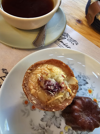 O espaço é aconchegante, cadeiras variadas (parece que cada pessoa que trabalha lá pôde levar uma para chamar de sua), uma pequena oferta de produtos artesanais feitos lá ou por parceiros da região. Fomos muito bem recebidos, da pessoa que tirou nossos pedidos à pessoa que recolheu as louças da mesa, passando pelo Gabriel, que explicou sobre os pães e, perguntado por mim, falou um pouco sobre as origens das pessoas que fazem do local uma experiência incrível de cafeteria, viennoiserie e panificação.