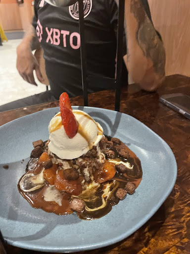 A costela estava boa e a maça que vem separada com a costela estava com tanta canela que a boca ficava adormecida A cebola veio queimada e com um Tempero forte horrível Os refrigerantes totalmente aguados A sobremesa estava boa
