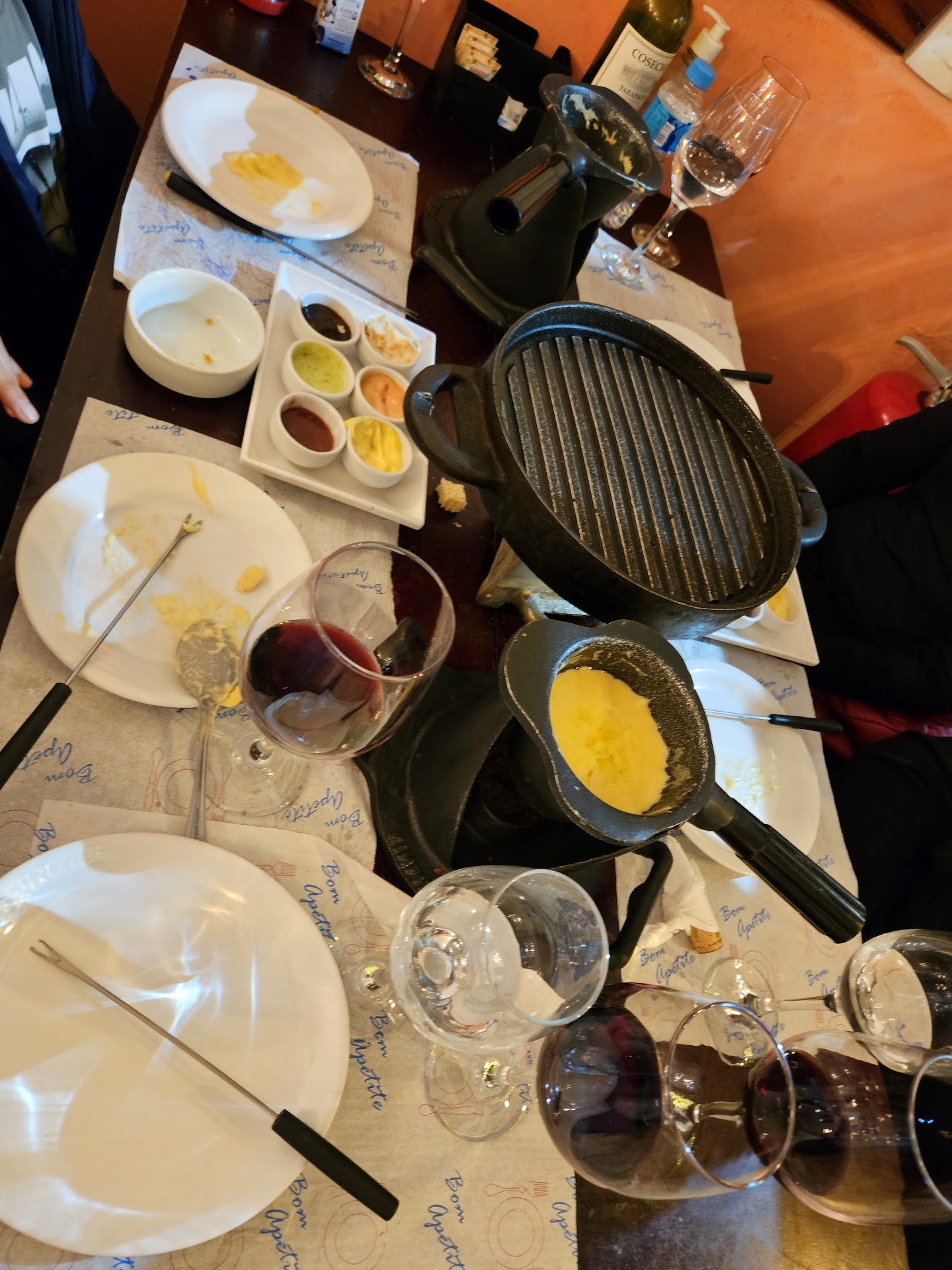 Só que quando chegaram com o restante dos pratos e garfos, já não tinha mais nada para comer. Restava uma chapa vazia pelando de quente (sem terem entregue as carnes), e um fundue de queijo sem nada para molhar (que acabou em 10 minutos).