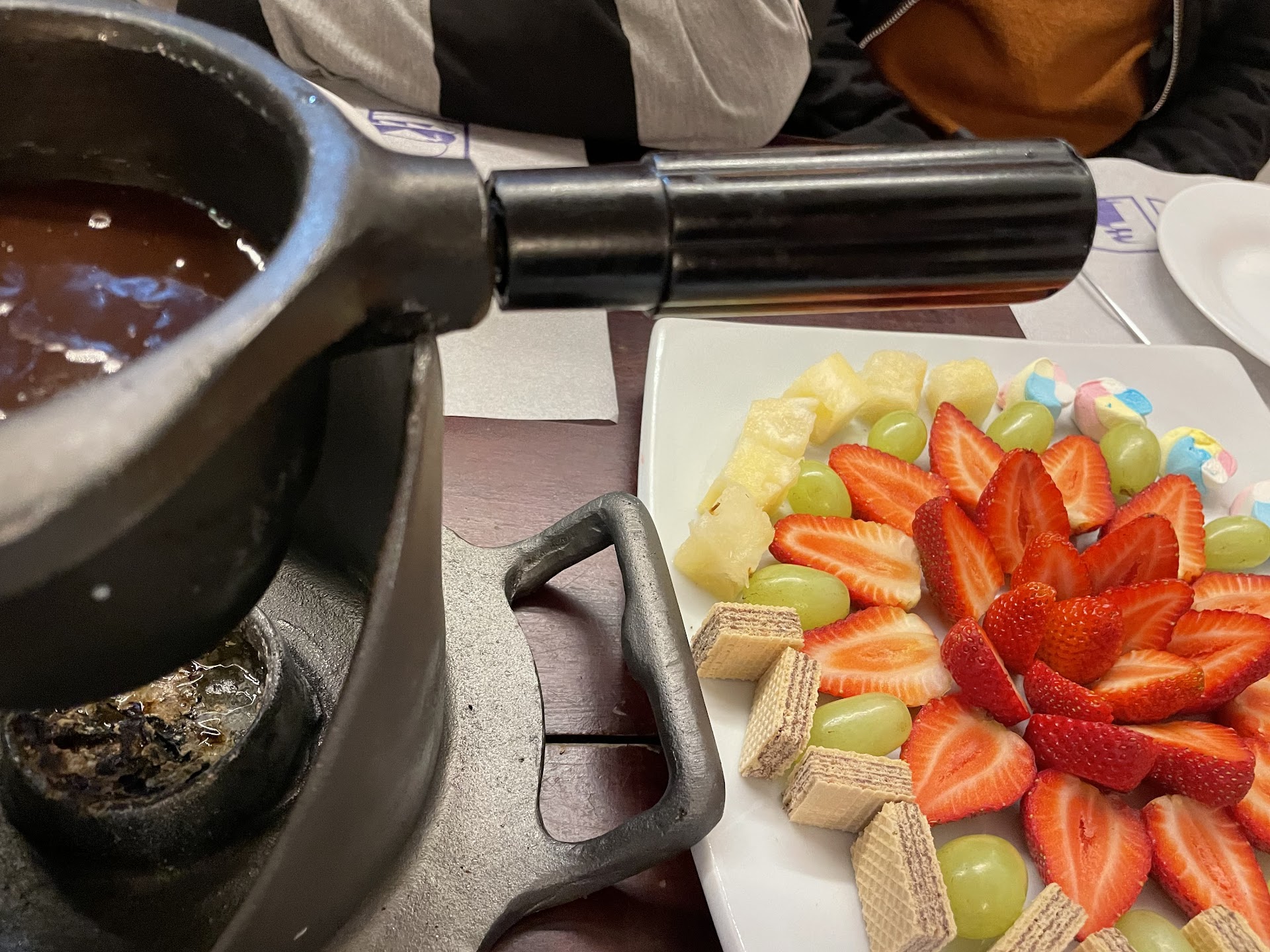 Depois veio o fondue de chocolate, muito gostoso, bem servido de frutas, incluiu bastante morangos (grandes), uvas, marshmellow, biscoito champanhe, waffle, banana e kiwi. (Esqueci a foto do fondue doce 😔)