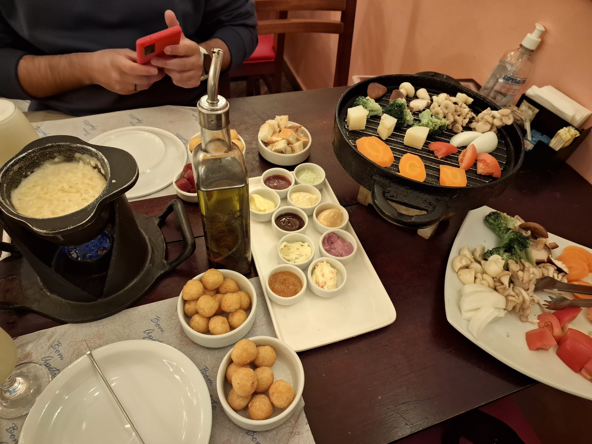 Depois de nos acomodarmos na mesa, uns 20 minutos depois colocaram a chapa de carne, o aparelho de fundue, uma meia dúzia de pedaço de pães e algumas batatas, acenderam os fogareiros e foram embora.