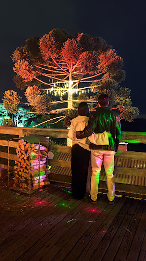 Outro detalhe que nos surpreendeu foi o áudio do show do Andrea Bocelli transmitido nos telões: a qualidade sonora era tão impressionante que realmente nos sentimos imersos no espetáculo. O restaurante também oferece mesas externas com fogueira, que criam um clima ainda mais encantador — há uma taxa adicional de R$100 para utilizá-las, mas vale para quem busca uma experiência ainda mais intimista.