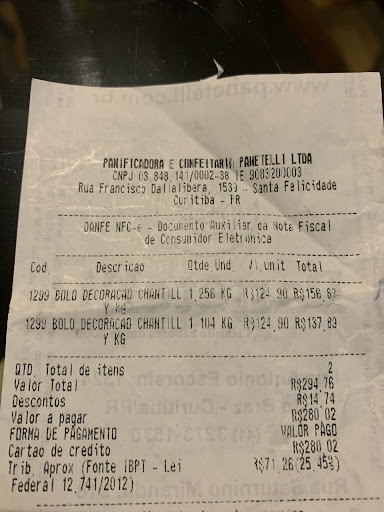 Read moreSou cliente da panificadora há muitos anos, mas neste final de semana passei por uma situação extremamente ridícula. Encomendei dois bolos de aproximadamente 1kg cada. Perguntei se era possível fazer o chantilly colorido. A atendente disse que sim e mencionou algo sobre incluir em outro código, mas em nenhum momento foi informado que haveria um custo adicional por isso. No dia seguinte, ao buscar os bolos, fui surpreendida com o valor que era de R$89,90 o quilo, o preço passou para R$124,90. R$35,00 a mais por bolo apenas pela cor do chantilly, nao havia decoração no bolo, foi somente a cor do chantilly. Fiquei muito indignada com a falta de transparência e profissionalismo. O mínimo que esperava era ser informada previamente sobre essa cobrança adicional antes de confirmar o pedido. A única compensação oferecida foi um desconto de 5%, o que está longe de reparar a frustração e o transtorno causados. Paguei praticamente um bolo a mais somente pela cor, é...