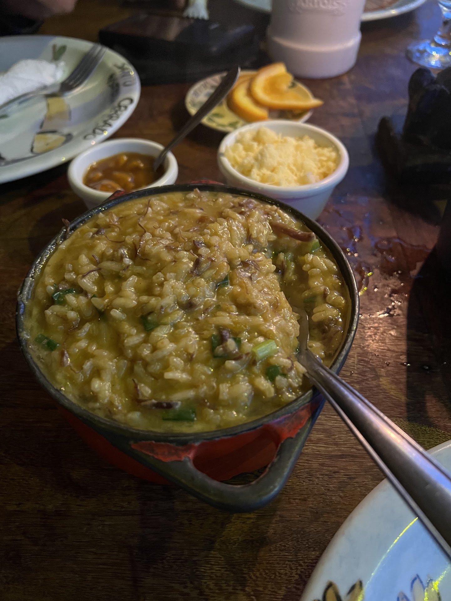 Read moreEstive na Santo Cerrado no dia 16 de Março. Sempre que vou à Vila de São Jorge visito a risoteria e sempre tive experiências ótimas, porém desta última vez tive problemas com o atendimento. Eu e minha noiva chegamos por volta das 20h30 e os dois andares já estavam lotados, pediram que esperássemos na parte de fora por alguns minutos para então entrarmos. O local de espera era grande e agradável, várias mesas, sentamos próximo a uma fogueira, e caso quiséssemos ser atendidos ali também era possível (era uma extensão do restaurante ao ar livre), mas como queríamos ir para o segundo andar e sentar nas almofadas resolvemos esperar. Em 15 minutos conseguimos uma mesa. Fomos acompanhados, nos acomodamos e logo um garçom apareceu para anotar nosso pedido. Resolvemos pedir dois drinks inicialmente, sendo que um deles tinha morango. Passaram-se 20 minutos os drinks ainda não haviam chegado. Havia apenas uma pessoa atendendo no segundo andar e ele estava andando depressa, sem prestar atenção no salão, tive que ficar em pé para conseguir a atenção dele. Foi então que ele disse que estavam sem morango e pediram que escolhêssemos outro drink. Fizemos a escolha e foram mais 20 minutos para os drinks chegarem. Na chegada das bebidas já fizemos o pedido do prato. Pedimos o risoto com camarão. Foram 50 minutos para o prato chegar e sinceramente, foi meio decepcionante, a quantidade veio bem regrada. Duas pessoas com um pouco mais de fome precisam pedir algo a mais pra complementar o jantar. Pelo valor cobrado imaginamos que a quantidade seria generosa. Por fim não tivemos mais “problemas” na noite, a questão da demora do atendimento e da quantidade servida deixaram bastante a desejar. Apesar de tudo o ambiente estava agradável. Foi a primeira vez da minha noiva no local, gostaria que ela tivesse a mesma experiência boa que tive das outras vezes, mas concordamos em conhecer outros lugares em...
