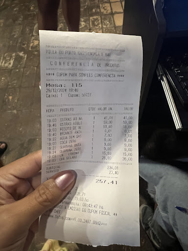 Minha experiência no Restaurante Villa do Porto foi TENEBROSA, péssima. Durante nossas férias em Florianópolis, meu marido e eu estivemos no restaurante no dia 07/10/24. Pedimos Lula à Dorê e Fiesta Frita (uma combinação de lulas, camarões, mariscos e banana à milanesa). Duas horas após a refeição, começamos a nos sentir extremamente mal devido à comida, que claramente estava estragada, já que não havíamos comido mais nada naquele dia.