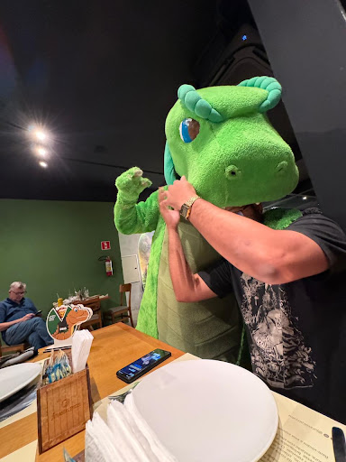 A casa é bem decorada, tem um dinossauro mega simpático interagindo com todos e funcionários prestativos também. Mas, se você curte conversar enquanto come, não vá. Se você não gosta de crianças, não vá. Se você gosta de crianças, também não vá. Te explico: o ambiente é menor do que parece, com mesas bem apertadinhas. Banheiros sem papel higiênico ou para as mãos. Criançada pra todo lado gritando. Aniversários e parabéns aos montes (o que é legal, até). Mas a comida é desastrosa. Todas as pizzas tem a mesma base... Molho e um tipo de muçarela. Daí para variar são acrescidos um ou outro pepperoni, uma ou outra calabresa, um tantinho de carne desfiada... Há sabores bem intencionados, mas quem sai de casa para comer pizza de alho, de brócoli com queijo, abobrinhas com queijo, rúcula com queijo?... As porções são infantis. Massa fininha e mini pedacinho (ideal para criancinhas). As pizzas doces tbm tem a mesma base: um chocolate derretido em que é acrescido amendoim ou côco ou confeitos etc. Na prática, tudo igual. Há fritas e frango a passarinho. Dependendo do local da mesa, é só isso que vai comer, pois só chegam pizzas de vegetais e alho. O grand finale... O preço: 230 reais para três pessoas sem contar o serviço. Cada um tomou um refrigerante. A proposta é jurássica, então se prepare para ter seu $$$ e sua...
