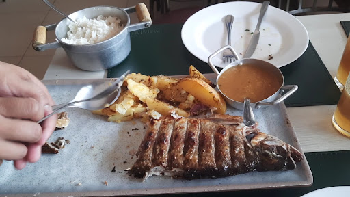 Read moreAtualização. Retornamos. Pedimos de entrada o jacaré empanado e a linguiça de jacaré. Achei um pouco borrachudo o empanado, mas a linguiça é sensacional, bem temperada e vem com molho chimichuri com ervas frescas e fatias de torrada na manteiga. O prato pricipal novamente pedimos a piraputanga na brasa. Dessa vez estava um pouco queimado o couro, mas nada de mais. Banheiro limpos. Fantastico. Um ótimo local para ir no calor, ja que é climatizado todo o ambiente. Antigo Fomos no almoço de Domingo. Ambiente climatizado, banheiros limpos. Fomos bem atendidos e logo o garçon já trouxe desenhos para as crianças pintarem. Não tem espaço kids no local. Pedimos de entrada a deguatação de jacaré grelhado (porção de 200g). Descobrimos que a porção de 100g é empanado e frito. Demorou uns 10 minutos. Suco pedimos de Guavira (gabiroba) achei muito doce, mas estava saboroso e recomendo com pouco açúcar. De prato principal pedimos a piraputanga na brasa. O prato chegou em 30 minutos. Bem rápido. De guarnição vem arroz branco e pirão e batata grelhado com alecrim. O garçon ao trazer o peixe, ele já corta em postas para servir os clientes na sua frene, bem bacana. Não tem espinho, pode dar para as crianças tranquilamente. O tempero do peixe é bem suave, bem como do pirão. Alias, o pirão é mais cremoso, diferendo do que estou...