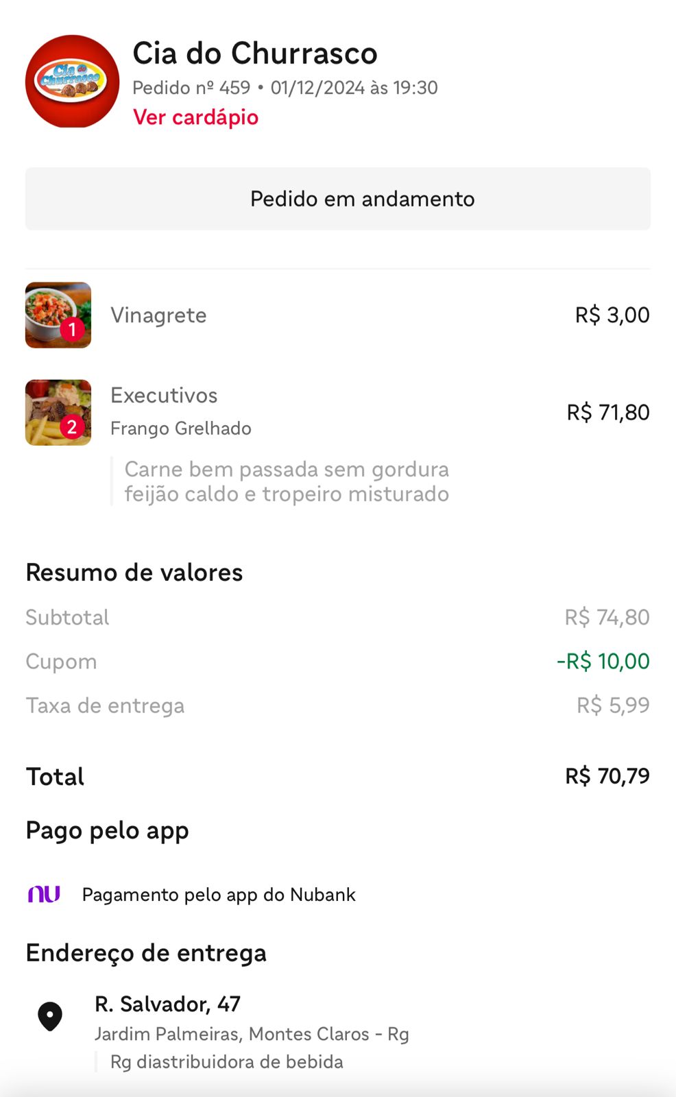 Read moreHoje tive o desprazer de pedir uma comida pelo IFOOD que após ver o tempo de previsaão solicitei o cancelamento que foi negado pela loja, após duas horas a comida não chegou, logo em seguida eles informaram que não seria possível o cancelamento e após isso eu não consegui fazer o cancelamento pela plataforma. Liguei na loja e uma pessoa chamada ANA PAULA, foi ainda muito mal educada, não deixava sequer eu explicar minha situação e simplesmente falava ao mesmo tempo que eu como se estivesse desesperada e sequer soube me informar ou me ajudar quanto a resoluçaõ do problema, eu pedi a comida pois estava com duas crianças para alimentar e não poderia esperar tanto tempo, infelizmente a entrega que estva prevista para 21:10 agora nesse momento 21:58 não havia chegado. Fiquei muito decepcionada ao ligar na loja e ser recebida por pessoas tão despreparadas, ERAcliente há muitos anos na CIA do CHURRASCO, porém depois desse epísodio comer qualquer coisa em paz seria muito melhor...