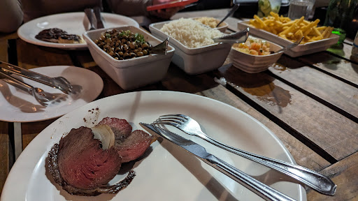 American review. Went in not knowing what to expect but it has a massive seating area and has a similar vibe to a nice sports bar. No pictures on the menu so we had to translate every food item and hope we got something good. Some parts of the menu say "for 2 people" or "for 4 people". We avoided those and went to the grilled meat section. We ordered two items from there but the waiter stopped us because he knew it would be a lot of food. Hint...500g = 17oz. With just the Cupim, shrimp and garlic bread appetizer my sister and I were super full. Wasn't the best I ever had but about what you would expect from an Applebee's. The happy hour is great. No English like most places but got along well with the basic phrases. Oh and don't sit next to the outer edge or you might be...