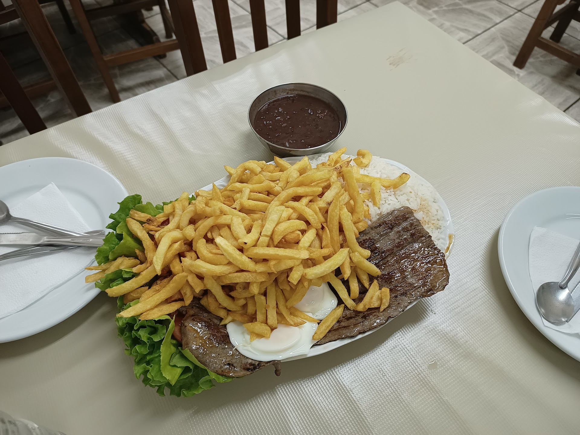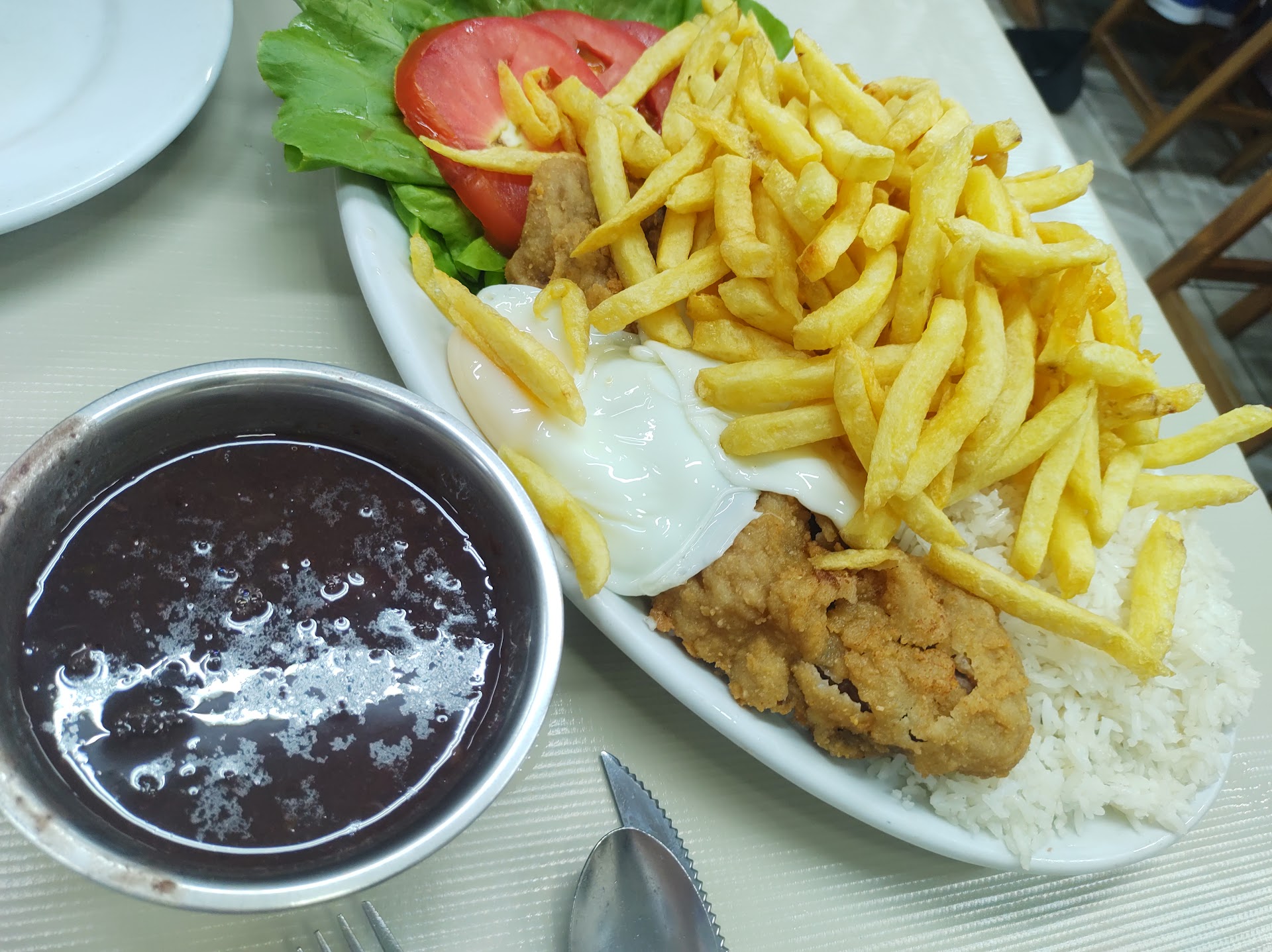 Apesar de ser um lugar popular de POA, foi a primeira vez que fui comer no local. Eu e meu namorado fomos num horário cedo para o jantar. Há diferentes ambientes, diferentes "salões": tem pelo menos uns três, mas não tenho certeza se tem mais. De fora não parece, mas o local é grande. Fomos rapidamente atendidos pelo garçom. Só achei o comportamento do garçom meio estranho, talvez ele já estivesse agindo "no automático". Pedimos uma Alaminuta com bife. Ficou pronto super rápido. E é realmente GIGANTE como costumam falar! Tanto eu como meu namorado somos bons de garfo, gostamos de comer bem, e estávamos com fome naquele dia. E não vencemos em comer tudo! Bahhhh, veio bastante arroz, bastante batata frita. O bife na chapa eu achei fininho, poderia ser um pouco maior. Veio um ovo pra cada um. Poderia ter vindo mais salada e mais feijão também. Deu pra ver que eles fazer o prato ser gigantesco por carregarem a mão nos carboidratos. Mas assim, a comida estava muito saborosa! Valeu a pena. Pagamos R$48,00 em dinheiro vivo. Se fosse no PIX ou no débito, o valor seria R$60,00. Há uma placa bem grande na rua informando que é esse o preço da Alaminuta (e é possível variar a forma da carne ser feita, só que agora não lembro de cabeça quais as opções...). O ambiente é bem raiz, simples mesmo. Me pareceu ser limpo. Mas claro, é um ambiente "agitado", de alta rotatividade, então as pessoas não costumam se demorar. Haviam famílias fazendo sua refeição ali, achei bem...