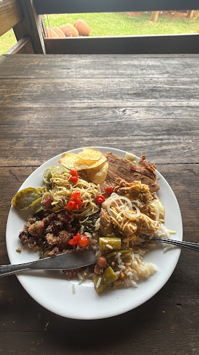 A refeição não se destacou em nada. O buffet era bastante simples, com um preço fixo. O churrasco era cobrado separadamente. No meu caso, optei apenas pelo buffet e fiquei desapontada com as opções de proteína disponíveis. O frango com ora-pro-nóbis estava cheio de ossos, o feijão com carne só tinha gordura, e a carne de panela estava sem gosto. A única proteína OK era o lombo de porco.