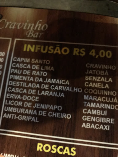 Tem grandes barris que armazenam as especialidades: todas as infusões produzidas na casa, que são o tradicional Cravinho (com cachaça, cravo, mel e limão), Canela (cachaça, canela, mel e limão), Jatobá (cachaça, casca de jatobá, mel e limão) e Senzala (casca de jatobá, casca de catuaba, cachaça e vinho seco), entre outras mais de 30 criativas variações. A dose custa R$ 5 e meio litro sai por R$ 20.