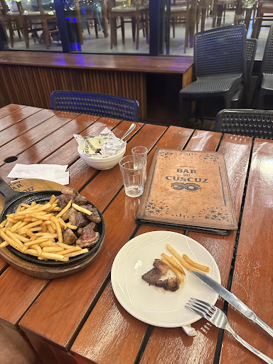 Desagradável ao extremo é o que de melhor posso escrever do pouco tempo que consegui permanecer no lugar. Na entrada, esgoto a céu aberto, e um odor desanimador. A construção e decoração do espaço são suntuosos, e de bom gosto, inegavelmente. O responsável, merece parabéns. O atendimento inicial, na entrada, aceitável, mas notadamente se dá sem treinamento algum. Fomos direcionados as mesas da area externa, e as quatro disponíveis, sujas, com enorme acúmulo de poeira. Em nenhum momento, ninguém se dispôs a limpar qualquer uma. Eu o fiz com guardanapos, ao deixar o local, já que os guardanapos foram entregues ao fim da refeição somente. O músico que se apresentava executava um repertório agradável, compatível com um bar, mas sua afinação era mais que questionável. Um local com esse número de lugares precisa selecionar melhor quem se apresenta. Apesar do ótimo repertório. A soda que pedimos, não era gaseificada como deveria ser, e ficou fácil perceber que economizam ao máximo na essência. Uma "água suja", parecia. O refrigerante, nao chegou. Nao conseguiram trazer durante o jantar uma lata de Coca-Cola. O prato escolhido, para dois, foi o que estampava os letreiros na cidade, a picanha Argentina com queijo. A picanha, era de qualidade muito, mas muito inferior a de qualquer uma já trazida da Argentina, e foi servida em um ponto diferente do solicitado. Claro que ignoraram o pedido. O arroz que a acompanhava, era uma "papa fria", e nem temperado foi. Inacreditável. A farofa, era só ruim. O cuscuz, prato que dá nome ao bar, muito ruim, no preparo, na execução. A mandioca, não tinha o cozimento adequado. O único acompanhamento que poderia ser servido ao menos em um "buffet de Shopping Center", era o feijão. Não tivemos coragem de provar sobremesas. Após pagamento, garçom, coitado, que parecia estar na sua primeira noite, pediu desculpas "por tudo ser meio bagunçado ali". É o que justifica uma estrela. Terem se desculpado por um breve mas inesquecível "show...