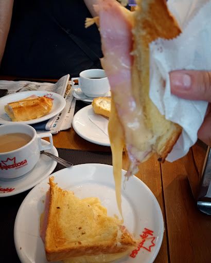 É uma padaria enorme, com muita variedade de produtos, tudo muito gostoso e bem feito. É caro, mas vale a pena. Os salgadinhos de festa (79,90 o kg) são maravilhosos, com destaque para os ovinhos empanados e os pasteizinhos de alho poró (89,90 o kg). No balcão da frente e na varanda, tem um espaço com mesas e cadeiras para quem quer consumir no local. Na parte interna, ficam as gôndolas com os produtos da casa e um segundo balcão, onde são pedidos os pães. Costumamos ir lá para tomar café da manhã, mas é um ótimo lugar para um lanche rápido a qualquer hora do dia. Gostamos das torradas com ovos e bacon (19,90), do pão na chapa (5,90) e do misto (13,90). Contudo, a melhor qualidade dessa padaria é o serviço, todos são muito simpáticos e atendem com muito carinho e presteza. Destaque para a Cynara, que atende sozinha às mesas. É impressionante a rapidez e eficiência, com muita simpatia. Ela sozinha faz o trabalho de 2 ou 3, sem perder a qualidade. Espero que o salário dela seja compatível com isso, hein, senhores donos da Majestosa!