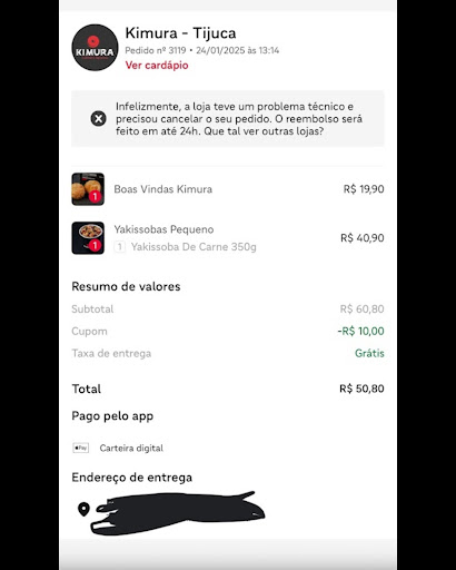 Hoje, em 10/7/23, minha esposa fez um pedido via iFood para o restaurante Kimura, localizado na Gonzaga Bastos, que atende na minha região. O porteiro entrou em contato através do interfone e informou que o entregador não subiria devido à grande quantidade de pedidos. Embora tenha achado essa razão um tanto abusiva, decidi descer para buscar o pedido.