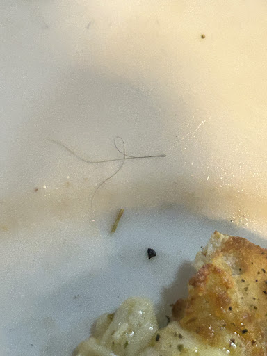 E ainda teve mais. Durante a refeição, tive o desprazer de encontrar um cabelo preto dentro do prato. Isso mesmo: um cabelo. Uma situação que, por si só, já anularia qualquer experiência gastronômica digna. Não reclamei no momento — apenas tirei uma foto. O nível de desprezo no atendimento era tão grande que reclamar ali seria o mesmo que falar com as paredes.
