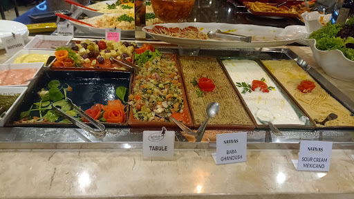2° nos dirigimos a mesa do buffet e tinham pouquíssimas opções. Frios só tinha um pote com uma salada de frio, um com salsicha em conserva, e maioneses, no qual, a de legumes estava AZEDA, mesmo tendo sido reposta enquanto estávamos ali. A parte de massas, tinha apenas duas opções, que estavam geladas e parcialmente cruas. A de frutos do mar CHEIAS de mosquitos e com cheiro forte, além da aparência/ apresentação feia e desorganizada. A parte oriental, totalmente exposta aos mosquitos, tudo espalhado sem especificar o que era o que, e pouquíssimas opções de sushis.