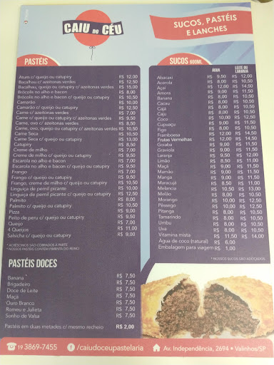 Eu acredito que seja suspeito pra falar do Caiu do Céu, considerando que frequentei essa pastelaria desde que ela abriu e sempre fui um grande fã! O incrível desse estabelecimento não são apenas os incríveis pastéis, lanches ou sucos naturais... mas o ambiente e filosofia familiar que existe e foi construído com muito esforço pra tornar esse lugar um ícone da cidade de Valinhos. Isso tudo enquanto ainda conseguiram manter aparentemente a qualidade de vida de quem trabalha ali e a qualidade do que eles servem!