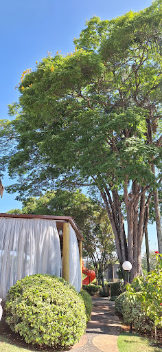 Ambiente externo é aconchegante, com árvores frutíferas ao redor, quiosques, pequeno lago e redário.