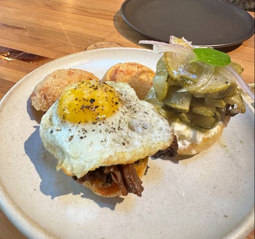 Por lá, de entrada, gosto da tábua para compartilhar (R$48,00). Vem com mini pão de queijo de alho — crocante por fora, leve por dentro, com o toque do alho aparecendo sem roubar a cena. O bijú seco entra como contraponto de textura, quebradiço, quase etéreo. A sardela à Brasileira traz picância e dulçor na medida, puxando para o defumado. A manteiga do dia, de banana, surpreende com dulçor e perfume — funciona quase como um doce de compota amanteigado suave, que se espalha bem no pão. O hommus de abóbora é sedoso, adocicado, com fundo terroso. O vinagrete de abobrinha amarra tudo com acidez sutil e frescor.