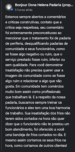 Sou frequentador do estabelecimento, desde que inaugurou, e de alguns tempos, estou notando que o atendimento piorou bastante, não se os funcionários estão passando por algum tipo de estresse, como sobrecarga de serviço, acúmulo de funções, talvez o pagamento não condiz com o serviço, e muitas vezes atrasa, ou às vezes os funcionários não tem um psicológico forte, ou não consegue expor isso para os patrões, e acaba descontando no cliente, e o pior de tudo, é o administrador da página da padaria no Google Maps, vir aqui e querer de rebaixar, com um manifesto tão baixo como o que recebi aqui hoje, porque não resolvem os maus entendidos, na hora no estabelecimento, deixam para vir depois aqui na comunidade, com muita audácia, desrespeitar o cliente do estabelecimento.