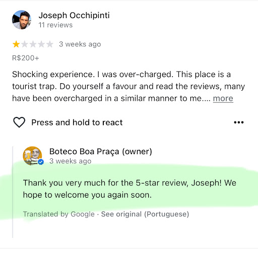Shocking experience. I was over-charged. This place is a tourist trap. Do yourself a favour and read the reviews, many have been overcharged in a similar manner to me. ••• They padded my bill with extra items (extra dish of rib eye steak and extra wine). It was my fault for not checking the bill there and then, but I did so as I was walking home. Unfortunately I couldn’t immediately return as the venue had just closed. ••• I returned the next day however and explained what had happened. They acknowledged they made the mistake but they needed to wait for the manager to return in order to have the refund approved. ••• Having already been there for 30 minutes, I wasn’t waiting longer for the manager to return from her lunch break. They told me the manager would call me. She didn’t, I was the one that had to follow up. ••• I spoke with the manager on the phone several times in the days that followed, and I was passed around to three different people. The final person (in head office) that I spoke with assured me the matter would be resolved and that I would be reimbursed (approx R$300). But nothing happened. ••• These calls turned into text messages and then eventually their replies stopped coming. My calls weren’t returned. I gave up. Infuriating. ••• Having spoken to a few people about what had occurred, apparently padding the bill was not that uncommon for tourists. ••• As it stands Boa Praca, you have stolen R$300 from me. Shame on your organisation.