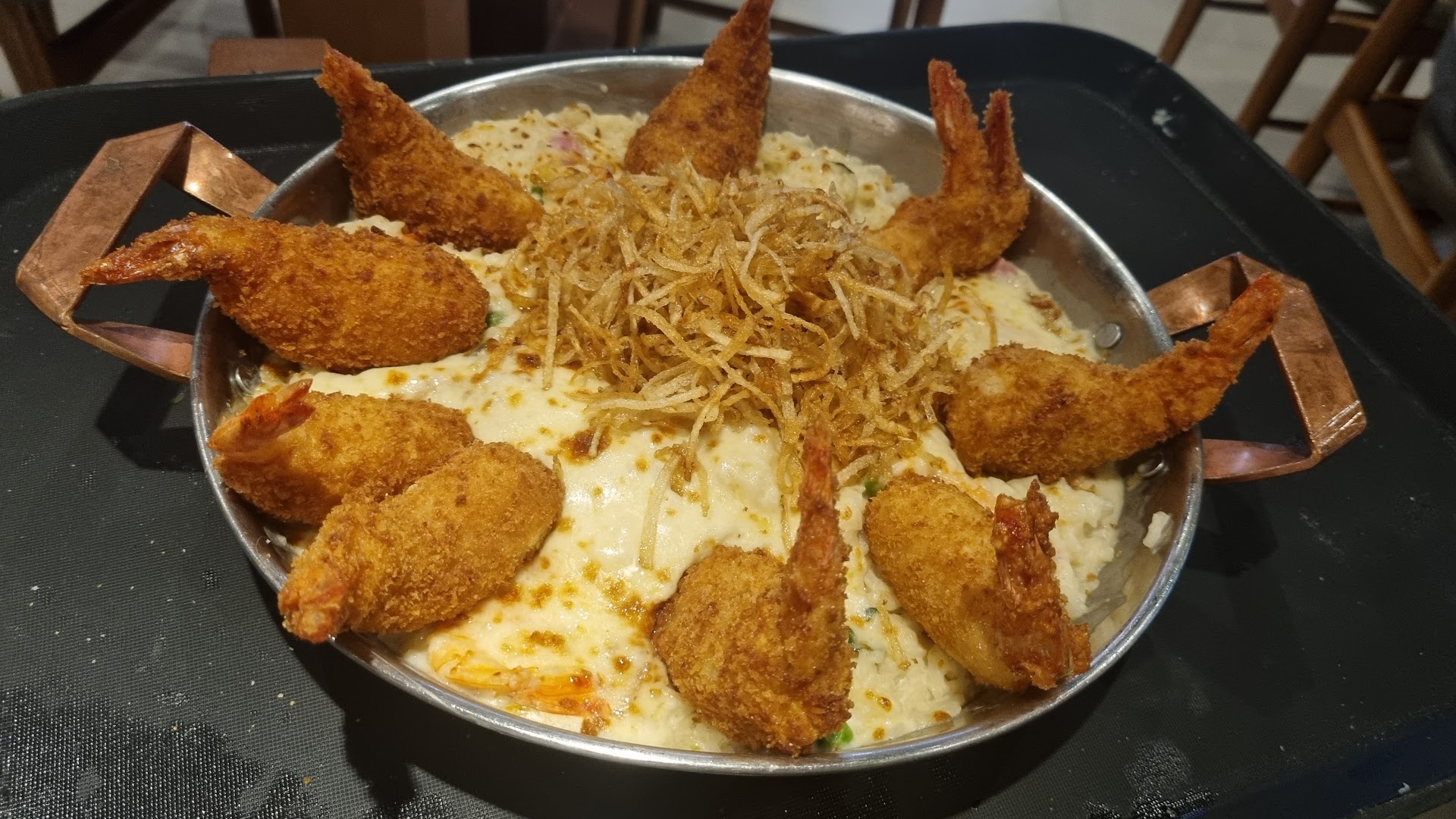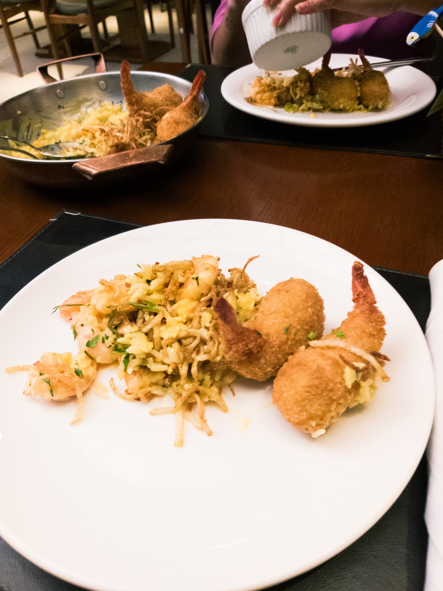 Puntos positivos: • Comida deliciosa y bien presentada: • El plato “Camarão Coco Bambu” es ideal para dos o tres personas. Los camarones rellenos de salsa bechamel, fritos, acompañados de arroz con nata, jamón y camarones, son contundentes y sabrosos.