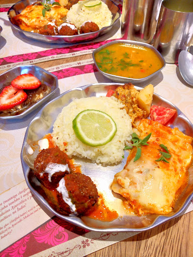 Nice vegetarian and vegan food, with indian inspiration is like a mix of east and west in one dish, starting always with a fresh salad. In one dish you can get the mix of cultures, last time I was there they have combinations like lassagna, pakoras and fried tofu in one side or dhal, rice, pakoras and veg mini burgers. Is not spicy food, as I said before, it has indian inspiration in some dishes but is not real indian food, so if you are expecting indian food you may be disappointed but if you are open to try something new you will be satisfied because food is tasty and they use good quality ingredients. Chili pickles...