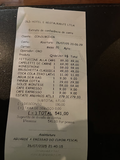 Péssimo. O vinho branco da Eslovênia que escolhemos no cardápio não estava disponível. Pedimos ao garçom Ivan que nos indicasse outro. Após ele consultar o sistema, nos informou que havia um vinho de origem grego (Atlantis) por R$159,00. Aceitamos a indicação. No final, a conta (extrato de conferência de conta) foi apresentada com uma descrição “wine dispenser” no valor de R$299,00. Ou seja, sequer nos apresentaram a descrição correta do produto consumido. Chamamos o garçom que disse que havia se enganado, que o valor constante do sistema está errado. Depois chamou uma pessoa que se identificou como Rafael Silva, que disse que o sistema apresentava inconsistência e estava errado. Ele propôs descontar a diferença do valor do vinho do serviço do garçom e do couvert artístico. Só que eventuais problemas no cadastramento não podem ser atribuídos ao empregado ou ao profissional que está ali fazendo sua apresentação musical. Nos entregaram outro extrato com a descrição do produto com um valor inferior ao primeiro extrato, mas ainda superior ao valor de venda (R$ 279,00). Ou seja, recebemos a informação incorreta do valor do produto. Até o valor da bruschetta Classic (entrada) foi cobrada com valor a maior! Pagamos a conta, com o valor da bruschetta correto, mas, ao final, sob o pretexto de que “o sistema estava fora do ar”, o restaurante não estava emitindo notas fiscais. Somente depois que liguei para o 190 é que o “sistema” emitiu a nota fiscal. Um absurdo! Erros seguidos que não podem ser admitidos em um restaurante desse porte. Temos registros de toda a conversa; dos extratos de conferência para comprovar o absurdo que estavam cometendo contra consumidores, informando valores para vender um produto e cobrando outro, além de somente fornecer a nota fiscal após chamarmos a polícia! Quanto...