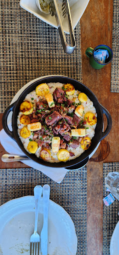 Read moreRestaurante com comida típica nordestina em ambiente rústico, no pavimento superior do Mercado Thales Ferraz. Aqui existe opção do Buffet a Quilo ou a la carte, que foi nossa opção. Pedimos de entrada um queijo coalho com melaço, um sarapatel de carneiro e uma carne do Sol (sim, só entrada). Estava tudo ótimo, a carne super macia e saborosa com bastante cebola e o sarapatel com pimenta de cheiro que não arde nada, mas tem muito sabor! Nosso prato principal foi o Camarão com Cueca, um tipo de moqueca com pouco dendê e bastante leite de coco, os camarões vêem com rabo, que o deixa ainda mais gostoso, pois o rabo do camarão pega bastante tempero. Eu sou baiano e entusiasta da moqueca baiana e posso afirmar com certeza que esse prato não deixa nada a desejar, muito saboroso e bem servido, com camarões grandes acompanhado de pirão também com camarões (o pirão parecia um bobó). De sobremesa pedimos uma Moça Virgem (sorvete de tapioca sobre doce de banana e um toque de canela) e uma Véia Fogosa (sorvete de tapioca com uma base de tapioca crocante e compota de frutas, no caso caju e morango), ambas maravilhosas! O preço é justo, depois de um banquete desses pagamos R$ 218,00 com bebidas (cerveja e suco de umbu da fruta - muito bom) e café. Um ponto que pode ser considerado negativo é o fato de não ser climatizado, mas o salão é coberto e bem ventilado. Enfim, gostamos muito e...