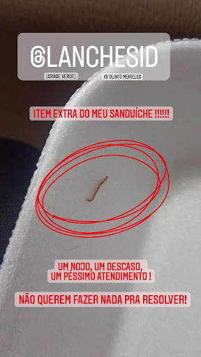 Read moreNo dia 22/03 solicitei um lanche na tele entrega do Sid Lanches. Um X tudo e um madrugadão, depois de 45 minutos, o motoboy chegou com o lanche. Ao abrir, tinha um pequeno bicho VIVO dentro do sanduíche. Imediatamente entrei em contato no Whatssap com a funcionária Joyce, que no primeiro momento não queria vir buscar o lanche, disse que o bicho foi encontrado em somente um hambúrguer e não nos dois, devido a isso, iria ressarcir somente um sanduíche. Depois de muita insistência, a mesma mandou o motoboy retirar o lanche e realizou o ressarcimento do valor. Porém, descontou R$ 5,00 da taxa de entrega. Venho por meio deste, relatar a minha insatisfação com a falta de higienização, com o atendimento prestado pela funcionária e pelo desconto da taxa....