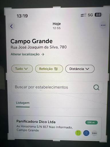 No aplicativo da Alelo, a Panificadora DICO aparece como conveniada em ambas as unidades (Mato Grosso e Hiroshima). Entretanto, percebi uma divergência: • Na unidade Mato Grosso, o cartão é aceito normalmente. • Já na unidade Hiroshima, por duas vezes tentei utilizá-lo e não obtive sucesso.