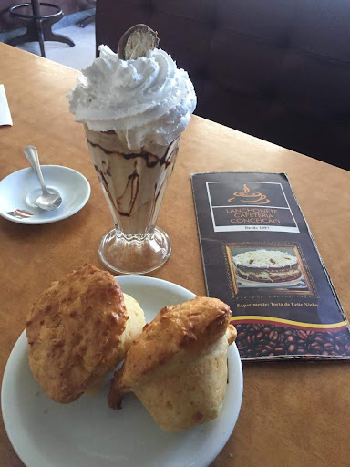 Custo benefício bom! Gosto mto do pão caseiro na chapa com queijo branco e peito de peru. O capuccino deles é top, já o chocolate quente parece toddy, não recomendo. da última vez tomei um com café expresso, cholocate 70% e chantilly (da foto), gostei bastante. O pão de queijo é melhor quando acaba de sair, depois fica duro parece um biscoito de polvilho. Também já comi um croissant que é enorme e gostoso, mas a massa não é folhada e sim igual um pão. Os bolos estão caindo na qualidade, a primeira vez que comi amei, depois percebi que a massa está seca, apenas do recheio ser generoso. O preço do bolo também é ótimo 16 reais a fatia. O único que continua bom é...