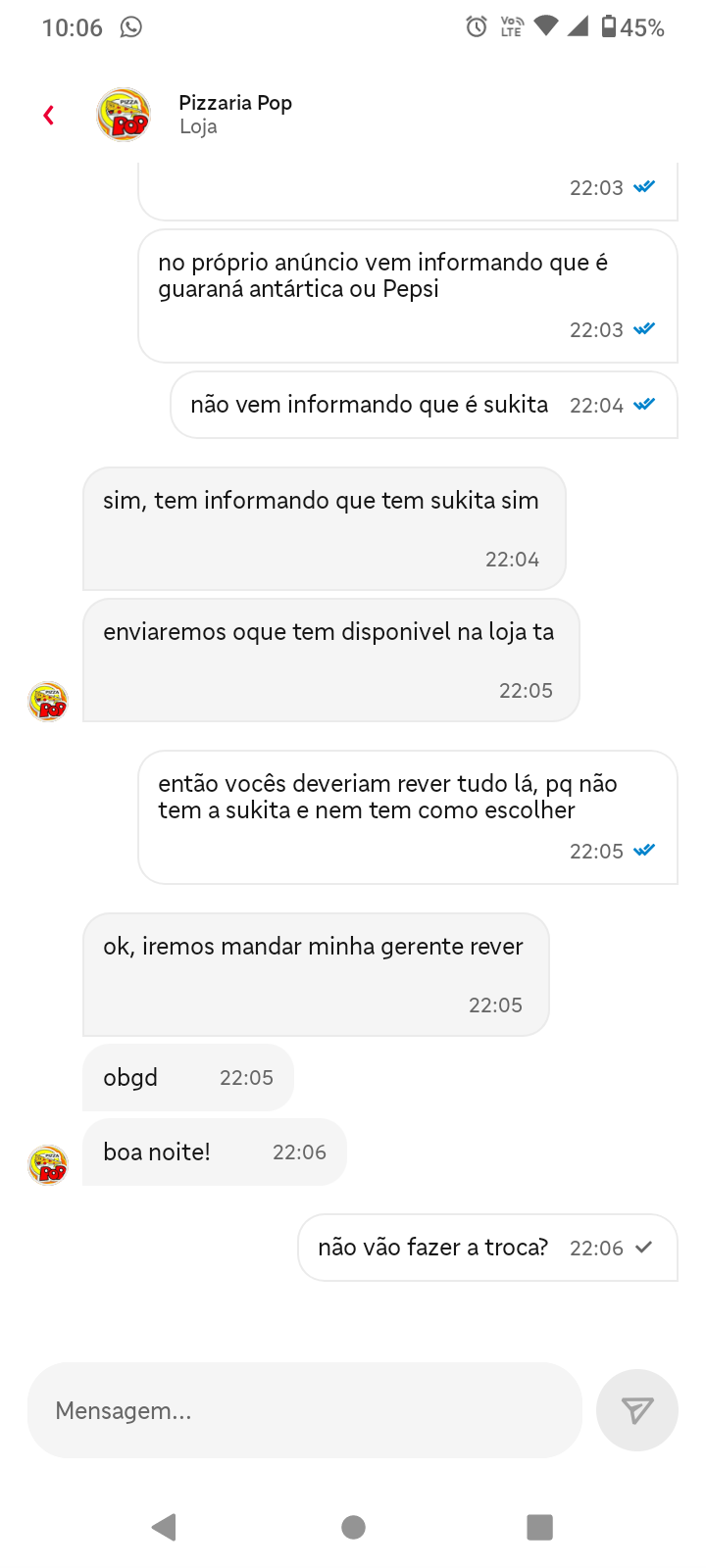 Read moreEntrei em contato com a loja, solicitando o reembolso, ou que me enviassem um novo pedido, atendente desligou na minha cara, entrei em contato via Whatsapp e a mesma fez deboche, falou que não me reembolsaria. Sendo que no site do ifood não mostra nenhuma informação para casos que o cliente não escolhe o sabor, que seria o padrão frango e calabresa, sou vegetariano e não como carne, informei atendente que no pedido coloquei receber a metade de marguerita, atendente voltou a debochar e disse que não iria resolver meu problema. Falta de ética do estabelecimento e me sentindo abandonado pelo app ifood por não conseguir resolver meu problema, já que não garantem minha segurança. A atendente sugeriu que devolvesse o pedido, mas minha mãe acabou comendo, já era tarde, mas sobrou quase toda pizza. No pedido fiz como orientado, na observação coloquei: meio marguerita e meia calabresa. O estabelecimento fez descaso e pouco caso com minha solicitação e atendente ainda gritou comigo na ligação. Enfim péssima experiência com o estabelecimento e com o aplicativo. Nota...