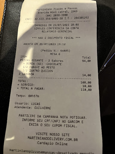 Depois de três anos voltamos pra reavaliar a pizzaria: (1) O ambiente - ampliou, mas precisa melhorar o ruído na parte da frente. A parte de dentro é mais silenciosa (recomendo) embora seja mais rústica. (2) O atendimento - muito bom, gentil e atencioso. Sorriso era constante e notei um genuíno desejo de nos agradar. (3) A pizza: pedimos 2 pizzas e 4 sabores. Massa bem fina, ingredientes de qualidade. Gostamos muito da de filé especial e da pepperoni catupiry e pesto. Já a margherita estava muito ruim, sem sabor e sem queijo. (Veja a foto da conta com as pizzas que pedimos). Depois pedimos 1 pizza 2 sabores doces (chocolate com morango e delícia de abacaxi). A primeira excelente como sobremesa, já a segunda não aguentei de tão doce. A combinação de açúcares me pareceu excessiva. (4) Estacionamento é o ponto fraco do local. Mas vc pode estacionar na rua e sugiro que o faça no lado oposto (outro lado do canteiro), pois em frente a pizzaria não tem vagas. (5) Preços - padrão de Natal das boas pizzarias. Eu diria que o preço é justo pelo que entrega, com exceção da pizza margherita que por ser uma pizza simples requer temperos e cuidados com a qualidade e quantidade de queijo que as outras não precisam. Para dois casais pagamos $51 por pessoa (conta de $204 com os 10%)