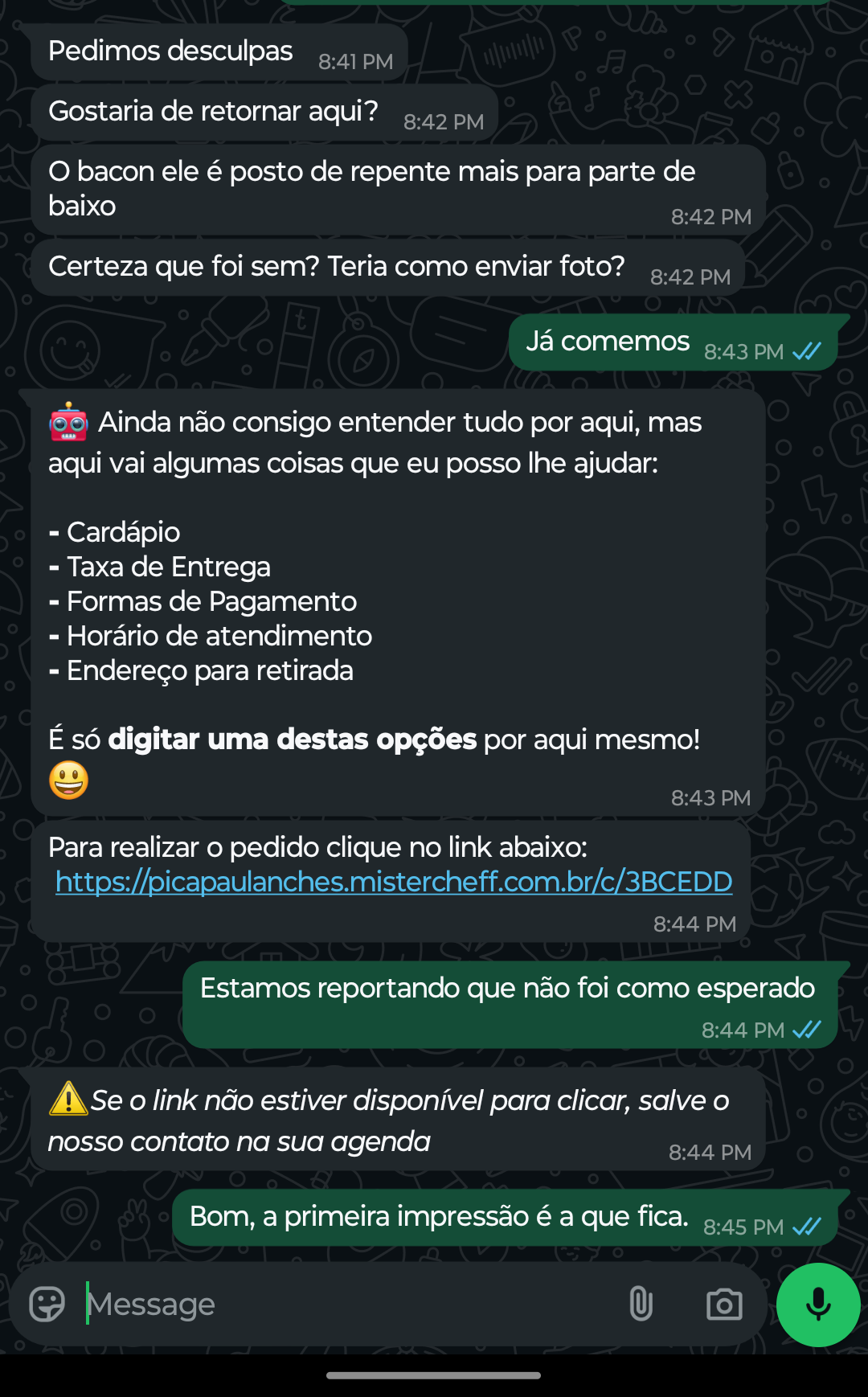 A situação ficou ainda mais frustrante quando, 40 minutos depois, a empresa me pediu para ir até lá buscar a maionese e tirar uma foto do lanche. Como se eu tivesse que montar o lanche para comprovar que faltava o bacon! A atitude foi absurda, ainda mais porque encerraram o atendimento no WhatsApp e não responderam mais.