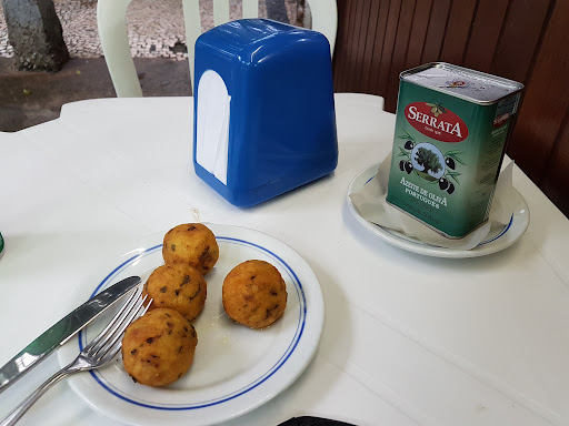 Read moreRestaurante muito tradicional e com uma vibe muito familiar. Fica localizado na praça conhecida como praça dos cavalinhos, com muitas árvores e ar de tranquilidade. O restaurante possui um ambiente agradável e com uma decoração que remete à Portugal. O serviço é rápido com uma equipe de garçons muito simpáticos. O carro chefe da casa com certeza é o bolinho de bacalhau. Servidos bem quentinhos e com bacalhau de vdd. O tempo todo passava uma bandeja cheia deles. Pedimos de prato principal, o risoto de camarão. Também gostamos. Só sentimos falta de um queijo parmesão mais fresco e cremoso, já que no preparo dele, não é adicionado o queijo. O queijo parmesão que foi servido à parte, era daqueles já endurecidos com aquela textura tipo pó. De sobremesa, pedimos pudim de leite e creme de ovos moles de Aveiro. O destaque, sem dúvidas, foi para a entrada...